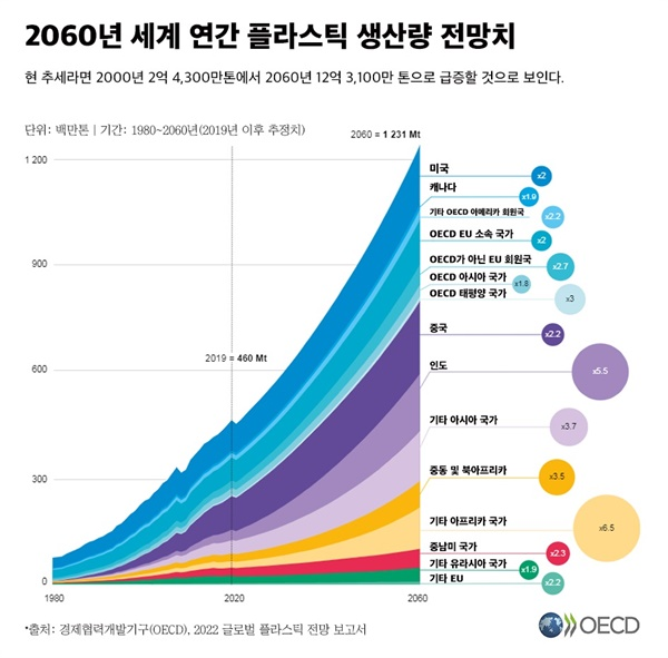 경제협력개발기구(OECD)에 따르면 전 세계 플라스틱 생산량은 2000년 2억3천만톤에서 2019년 4억6천만톤으로 늘어났으며, 이러한 패턴이라면 2060년에는 12억 3천만톤으로 증가할 것으로 전망되었다.